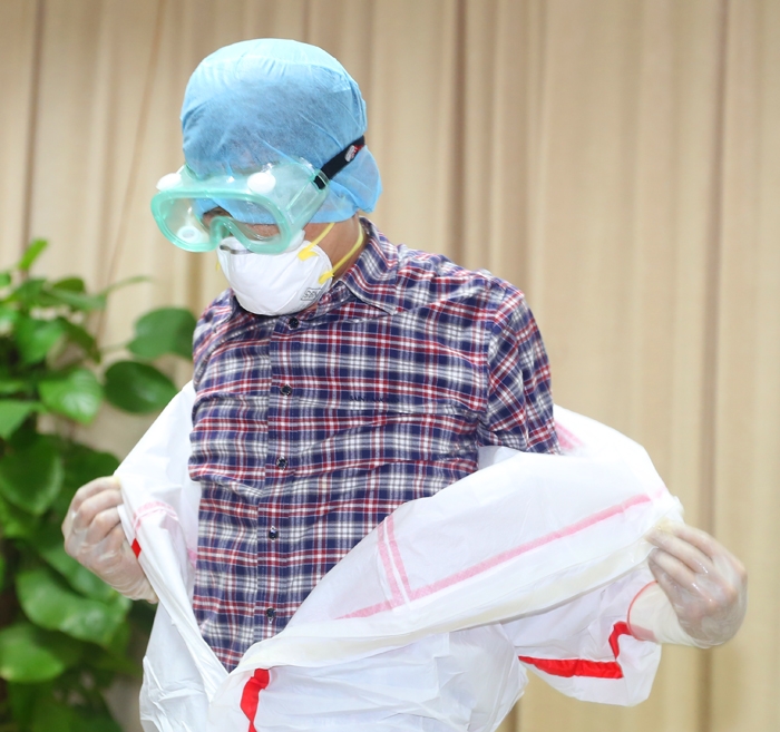 感染科盧偉力副主任演示如何正確佩戴N95口罩及防護(hù)手套、正確穿脫連體防護(hù)服等