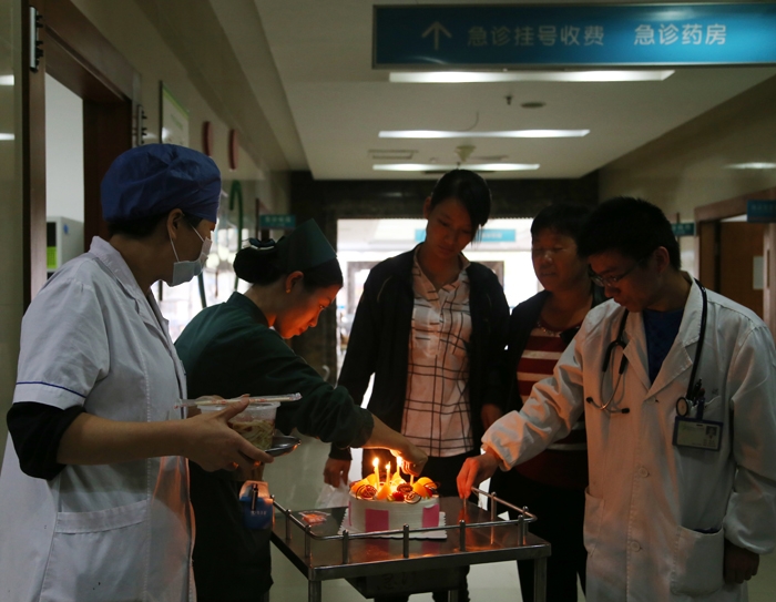 ??? 10月20日,對于躺在急診病房病床上的陳濤(化名)來說,是難忘的一天?!白D闵湛鞓贰⒆D闵湛鞓贰?,當醫(yī)護人員推著小車,唱著生日歌把蛋糕和面條擺在他面前時,他激動地眼眶都濕潤了,一直說到:“沒想到醫(yī)生護士會記得我的生日,謝謝!謝謝!你們不僅救我的命,還給我過生日,我不知道要怎么感謝你們!”這簡單、樸實的話語讓在場的人都備受感動。