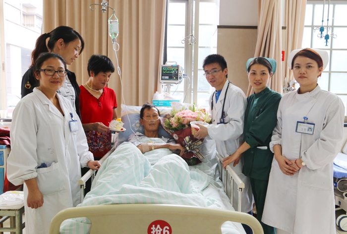 ??? 隨時有病情惡化的陳濤有一個愿望,他從沒有為自己慶祝過生日,希望自己能渡過這次的生死關(guān),在60歲生日的時候,吃到生日蛋糕,和家人開開心心的過個生日。得知此事的醫(yī)護人員把此事悄悄的記在了心上,蛋糕、鮮花、長壽面,所有的準備工作都悄悄的進行著。經(jīng)過綜合治療,陳濤的情況稍有好轉(zhuǎn),可以自己進食,表現(xiàn)出極強的求生欲望。生日當天,伴著生日快樂的歌聲,他在女兒的幫助下一起吹了蠟燭,品嘗了醫(yī)護人員精心準備的蛋糕和長壽面。主管醫(yī)生陳毓說:“老陳,你一定要堅強!不能放棄!”