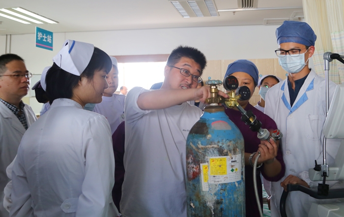 ??? 本次突發(fā)狀況“發(fā)生”在重癥監(jiān)護(hù)室,參加演練的醫(yī)生、護(hù)士們按照預(yù)案迅速就位,緊張而有序地處理著這一危機(jī)情況,啟用替代設(shè)備保障危重病人正常吸氧,整個過程有條不紊,忙而不亂。