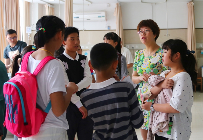 ??? 第一站,兒科病房。責(zé)任護(hù)士洪顏向他們介紹了病房的環(huán)境及工作流程,隨后,帶著小記者一起和醫(yī)生進(jìn)行了晨間查房,看醫(yī)護(hù)人員如何對患兒進(jìn)行細(xì)致的檢查,對患兒家屬提出的疑問進(jìn)行耐心的解答。在查房的過程中,小記者還為住院的患兒送上了“六一”兒童節(jié)的禮物,希望他們能早日康復(fù)!