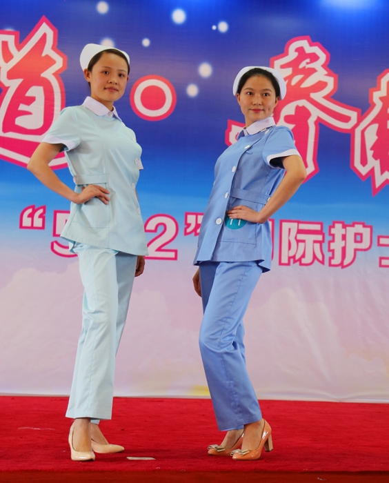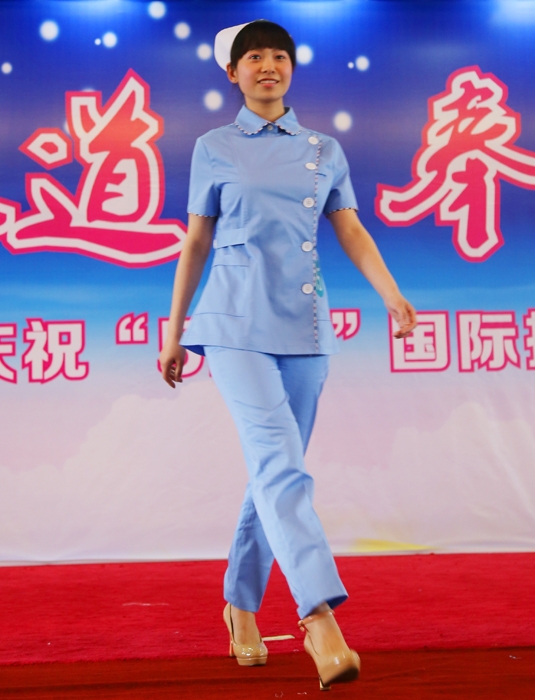 ??? 活動現場,20套新版護士服在T臺上進行了展示,導診服、孕婦服、分體裝、冬裝;淡藍、淺綠、嫩粉、小碎花……表現了最現代、清新、簡約、端莊、靚麗的護士形象,精彩節(jié)目充分展示了白衣天使們剛柔并濟、多才多藝的一面。