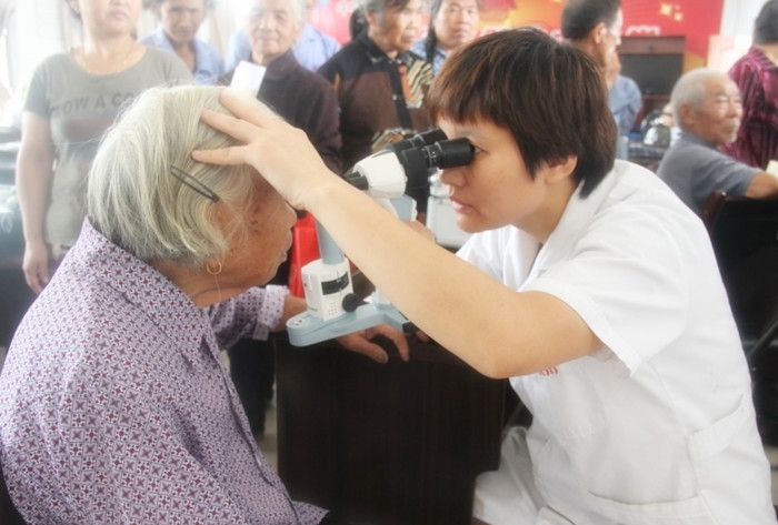??????????????????????????????????????眼科義工小分隊(duì)為前來(lái)篩查白內(nèi)障的村民進(jìn)行眼疾篩查