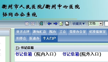??? 該院職工有關(guān)于醫(yī)院民主管理、政治思想工作及行業(yè)作風(fēng)建設(shè)等方面的建議、意見(jiàn),可以點(diǎn)擊醫(yī)院網(wǎng)站進(jìn)入內(nèi)網(wǎng)(OA網(wǎng))或直接通過(guò)內(nèi)網(wǎng)個(gè)人門(mén)戶(hù)下的“書(shū)記信箱”一欄,進(jìn)入“書(shū)記信箱”給書(shū)記留言。