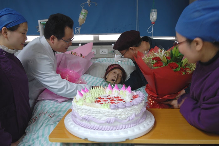 12月21日下午,我院EICU病房里情誼濃濃,該病房的醫(yī)護(hù)人員給90歲的住院病人周文貞送上了蛋糕和鮮花,為老人過了一個特別的90大壽。