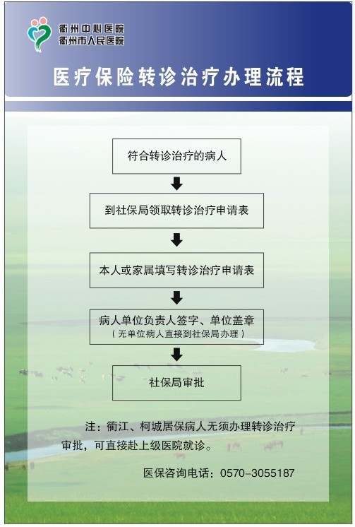 醫(yī)療保險(xiǎn)轉(zhuǎn)診治療辦理流程 文章來源:醫(yī)保辦 作者:醫(yī)保辦 點(diǎn)擊數(shù):14967 更新時(shí)間:2012-09-11 上一篇: 衢州市衢江區(qū)人民政府辦公室關(guān)于完善城鄉(xiāng)居民基本醫(yī)療保險(xiǎn)管理辦法的通知 下一篇: 最多跑一次”又升級(jí)!28種大病保險(xiǎn)特殊用藥,在衢州這些藥店可刷卡結(jié)算