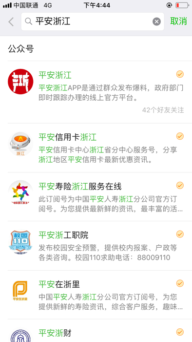 1、在微信中搜索“平安浙江”公眾號并關(guān)注。