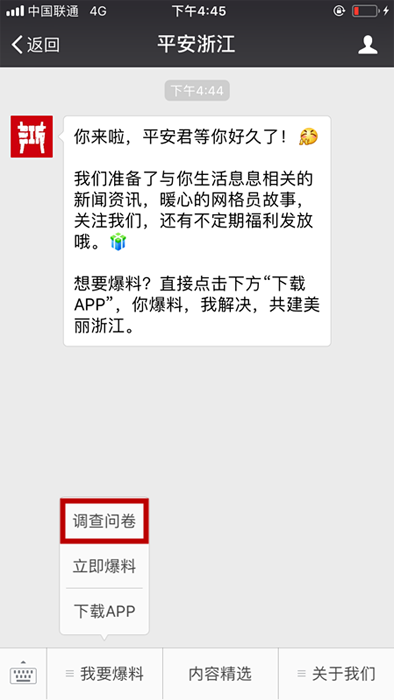 2、點擊最下方“我要爆料”,選擇“調(diào)查問卷”