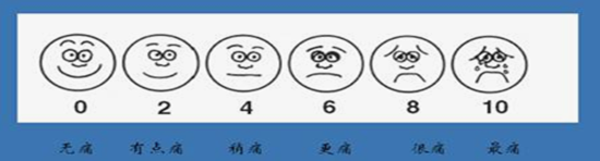 0分:無痛;3分以下:有輕微的疼痛,患者能忍受;4分—6分:疼痛明顯并影響睡眠,需止痛;7分—10分:有漸強(qiáng)烈的疼痛,疼痛難忍