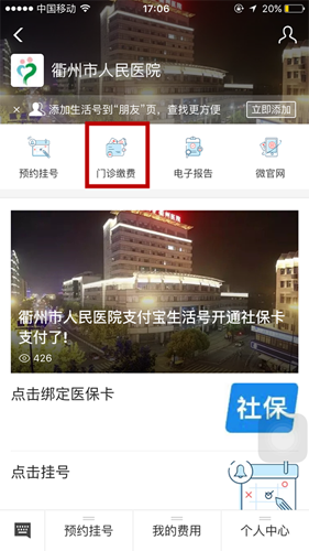 當(dāng)您在醫(yī)生診間處完成就診,醫(yī)生開(kāi)具了處方或檢驗(yàn)、檢查單,您就可以點(diǎn)擊進(jìn)入“支付寶”衢州市人民醫(yī)院生活號(hào),在頁(yè)面上方點(diǎn)擊門(mén)診繳費(fèi)。