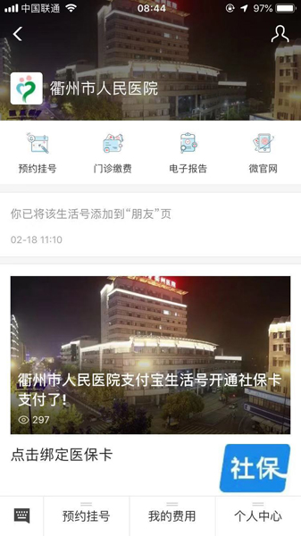 1、打開(kāi)支付寶,關(guān)注“衢州市人民醫(yī)院”支付寶生活號(hào),綁定醫(yī)???。