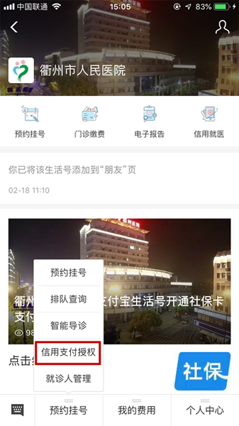 2、在“預(yù)約掛號(hào)”中選擇“信用支付授權(quán)”,點(diǎn)擊簽約,開(kāi)通“支付寶信用支付”,即完成簽約。