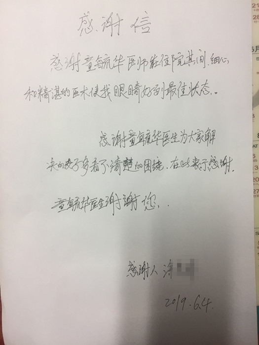 6月4日上午,我院的眼科門診一如既往地忙碌著,涂女士特地拎著一袋水果,揣著一封感謝信,走進(jìn)了眼科診室,要當(dāng)面感謝童毓華主任醫(yī)師。