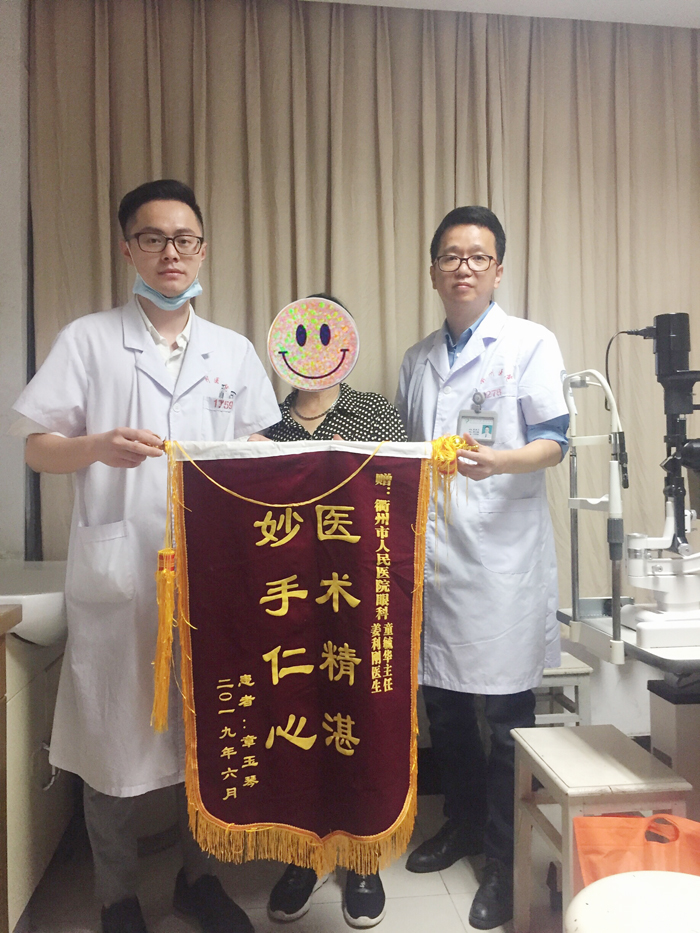 6月19日上午,市民章阿姨來(lái)到市人民醫(yī)院眼科門(mén)診,將一面印有“ 醫(yī)術(shù)精湛 妙手仁心”的錦旗送到童毓華主任醫(yī)師和他的學(xué)生姜利剛醫(yī)生的手里,并感激地說(shuō):“真的特別感謝你們,多虧了你們的幫助,才讓我及時(shí)地來(lái)院治療,并順利地用上了藥!”