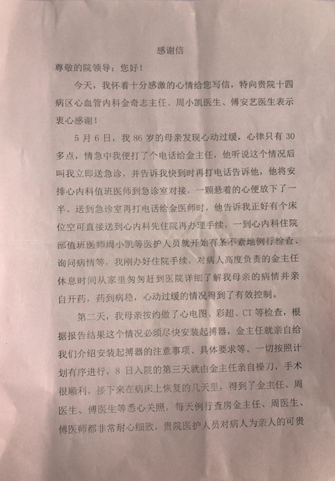 據(jù)悉,5月6日,陳先生的母親——86歲的童奶奶因?yàn)樾膭舆^緩被緊急送到我院急診科,原本在家休息的心血管內(nèi)科主任醫(yī)生金奇志接到通知后緊急趕來醫(yī)院,在了解患者情況后立刻展開救治工作。經(jīng)過一系列常規(guī)檢查后,為童奶奶進(jìn)行了安裝心臟起搏器手術(shù),術(shù)后經(jīng)過精心治療護(hù)理,恢復(fù)良好,目前已經(jīng)痊愈出院。