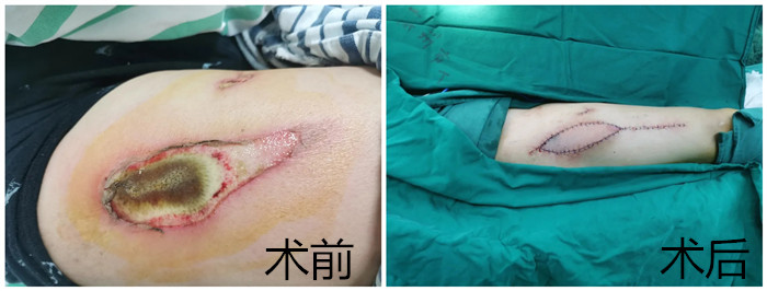 術(shù)前,王健教授團(tuán)隊(duì)趕往急診病房再次查看陳師傅病情,耐心講解手術(shù)方式及預(yù)后注意事項(xiàng)。隨后,王健帶領(lǐng)團(tuán)隊(duì)為陳師傅行全麻下“右大腿焦痂切除術(shù)+擴(kuò)創(chuàng)+穿支帶蒂皮瓣轉(zhuǎn)移術(shù)”。