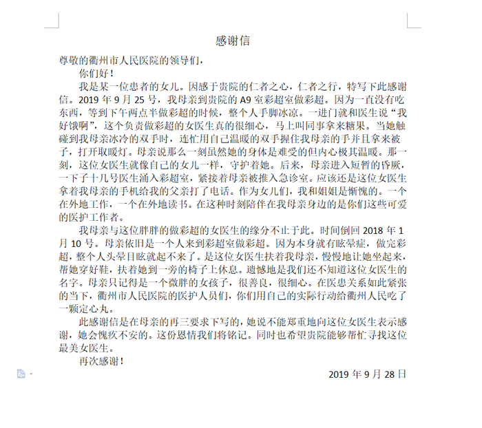 感謝信(致彩超室薛格醫(yī)生) 文章來(lái)源: 作者: 點(diǎn)擊數(shù):9667 更新時(shí)間:2019-10-07 上一篇: 感謝信(致衢州市人民醫(yī)院、耳鼻咽喉科徐建榮) 下一篇: 感謝信(致金勝橋志愿者)