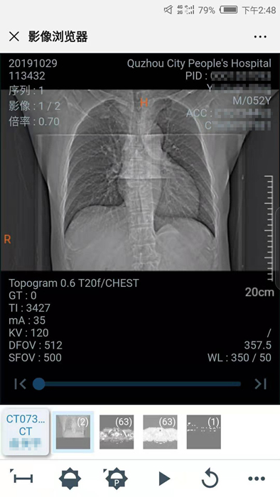 10月30日,住院患者俞先生收到一條短信提醒“【云影像】衢州市人民醫(yī)院提醒您,俞先生的CT報(bào)告已完成……”俞先生隨即點(diǎn)擊手機(jī)上的瀏覽鏈接,輸入身份證后六位,驗(yàn)證完成,短短幾秒鐘,躺在病床上也能查看到自己的CT電子報(bào)告和影像,俞先生直呼神奇。