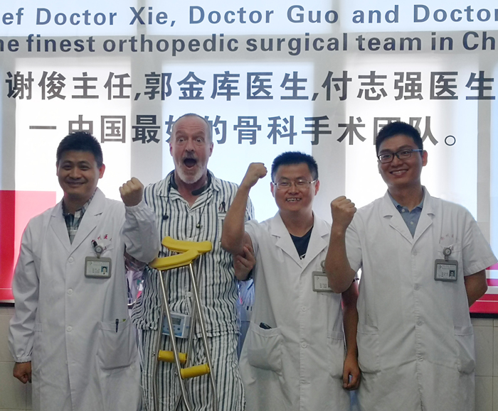 原來,Chris因?yàn)檫\(yùn)動量比較大,右膝也受過傷,曾在美國做過7次手術(shù)。在中國住院治療期間,醫(yī)院骨科團(tuán)隊(duì)優(yōu)質(zhì)的診療、貼心的服務(wù)給他留下了難忘的印象。