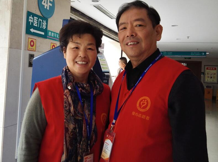 王建中是木材廠的一位退休工人,有一次,陪愛人董健玲去省城看病,志愿者熱心的服務(wù)給他留下了深刻的印象。我院愛心志愿服務(wù)中心成立當(dāng)年,他就報(bào)名參加。愛人董健玲聽說后,也一起加入愛心志愿服務(wù),夫妻雙雙成了我院的志愿者。每周,王建中和董健玲都會(huì)輪流抽出半天時(shí)間早早地來到醫(yī)院,指引患者就診、指導(dǎo)使用自助機(jī)掛號(hào)繳費(fèi),打印膠片……夫妻倆這一干就是4 年。