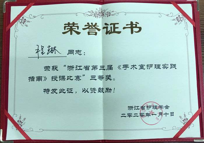 經(jīng)過選題定位、教案設(shè)計、授課方式等方面的精心設(shè)計,程琳代表衢州地區(qū)與浙江大學(xué)醫(yī)學(xué)院附屬第一醫(yī)院、浙江大學(xué)醫(yī)學(xué)院附屬第二醫(yī)院、浙江大學(xué)醫(yī)學(xué)院附屬邵逸夫醫(yī)院等省內(nèi)眾多醫(yī)院的優(yōu)秀選手同臺競技。經(jīng)過激烈緊張的角逐,程琳以穩(wěn)健的臺風、別出心裁的教案設(shè)計得到了評委老師的肯定,榮獲浙江省第三屆《手術(shù)室護理實踐指南》授課大賽三等獎,是歷年來最好成績。