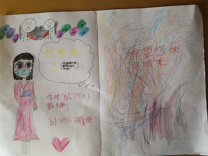 昨日,隔離留觀病房的鄭彩霞終于回了一次家,兩個女兒畫了兩幅畫送給奮戰(zhàn)疫情一線的媽媽,當媽媽回家時,孩子問:“媽媽,病毒被打跑了嗎?” 鄭彩霞笑著說:“病毒很快就會被打跑了!”