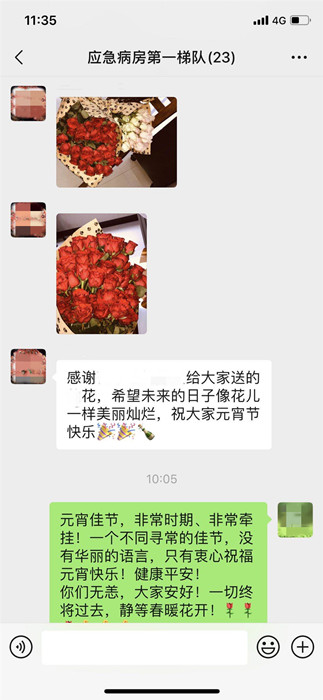 元宵節(jié)一早,我院浮石院區(qū)隔離病房的醫(yī)護人員收到了一份特別暖心的祝福?;ㄐ械奶m女士送來了鮮艷的紅玫瑰,她說,在這個特別的日子里, 你們不能與家人團聚,辛苦了!你們不是一個人在戰(zhàn)斗,身后是全市人民的支持!