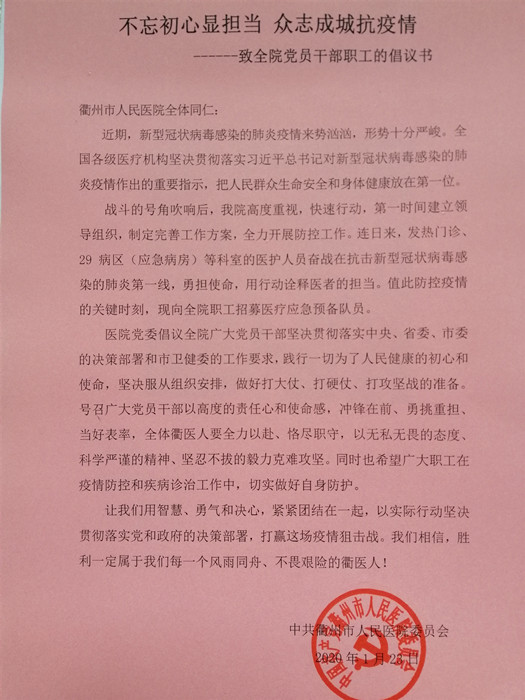 隨著新型冠狀病毒肺炎疫情的持續(xù)變化,我院防疫控疫的號(hào)角又一次吹響。1月26日,醫(yī)院黨委向全院黨員干部職工發(fā)出倡議,組建新型冠狀病毒感染肺炎防控應(yīng)急后備志愿隊(duì)。