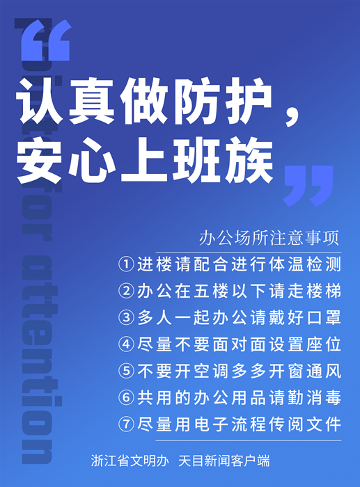 復(fù)工啦!防護(hù)措施做起來!安心工作不用愁! 文章來源:浙江省文明辦 天目新聞客戶端 作者: 點(diǎn)擊數(shù):6649 更新時(shí)間:2020-02-20 上一篇: 預(yù)防新型冠狀病毒感染,營養(yǎng)科專家教您如何吃! 下一篇: 手機(jī)可能傳播新冠病毒!專家演示1分鐘“手機(jī)消毒法”