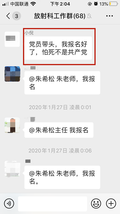 “怕死不是共產(chǎn)黨員!” 醫(yī)院黨委招募醫(yī)療應(yīng)急預(yù)備隊員當(dāng)天,放射科技術(shù)人員踴躍報名,倪晨峰第一個在科室群里報名加入應(yīng)急預(yù)備隊。