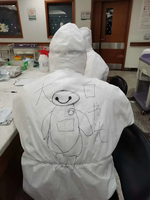 2月21日,結(jié)束了一天的護(hù)理工作后,她又在防護(hù)服背后畫畫報(bào)平安,“我愛(ài)星爸爸”“晚安,祝你好夢(mèng)”“大白書(shū)光”……一句句詼諧的話語(yǔ)看似調(diào)侃實(shí)則溫情滿滿,你能猜出哪一個(gè)才是調(diào)皮的她嗎?