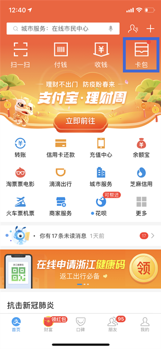 1、打開“支付寶”APP首頁,點擊:卡包→證件→健康碼。