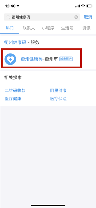 方法一:打開“支付寶”APP首頁,搜索:衢州健康碼。