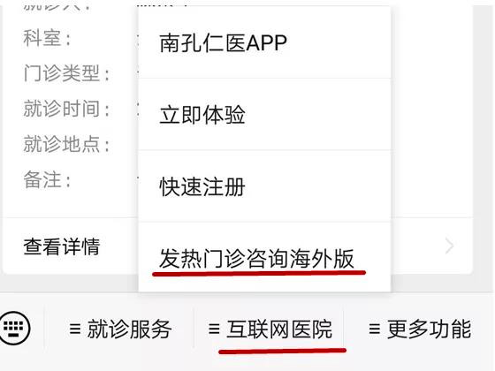(二)點擊第二個菜單“互聯(lián)網(wǎng)醫(yī)院”,選擇‘發(fā)熱門診咨詢海外版