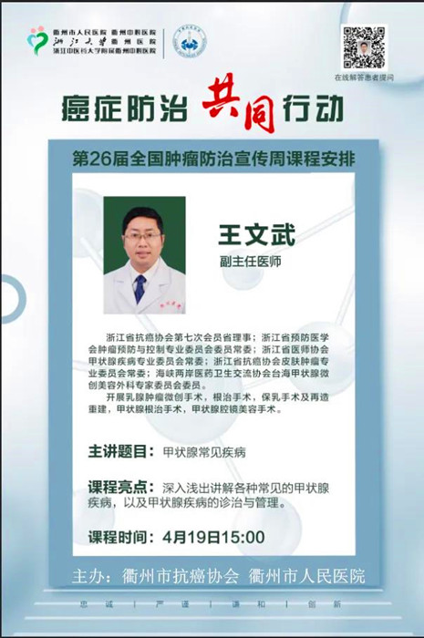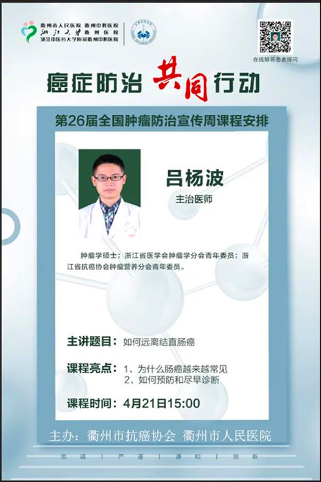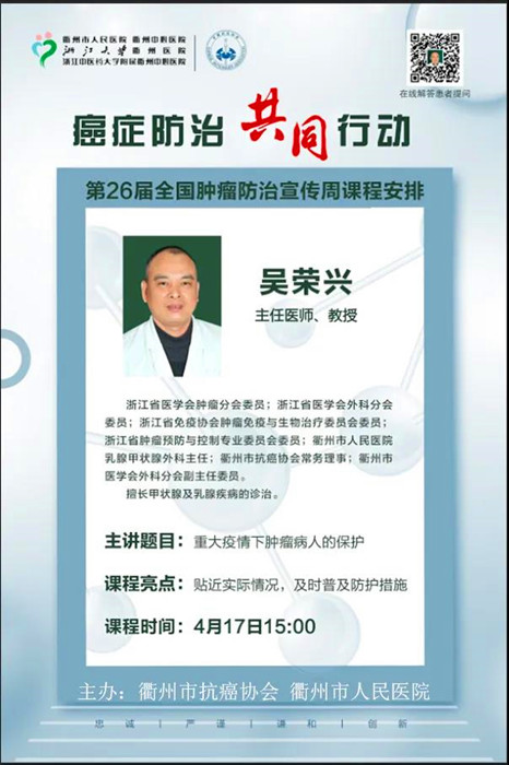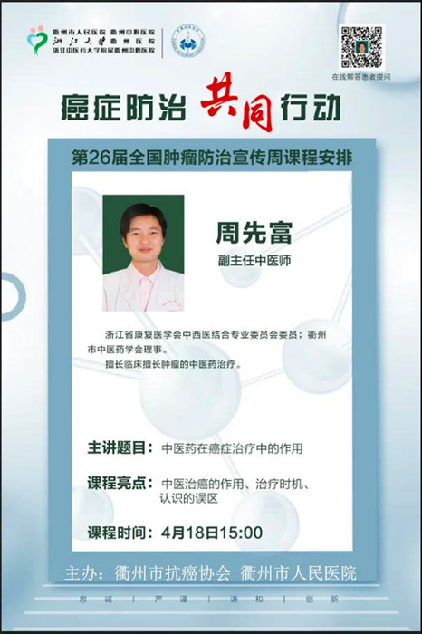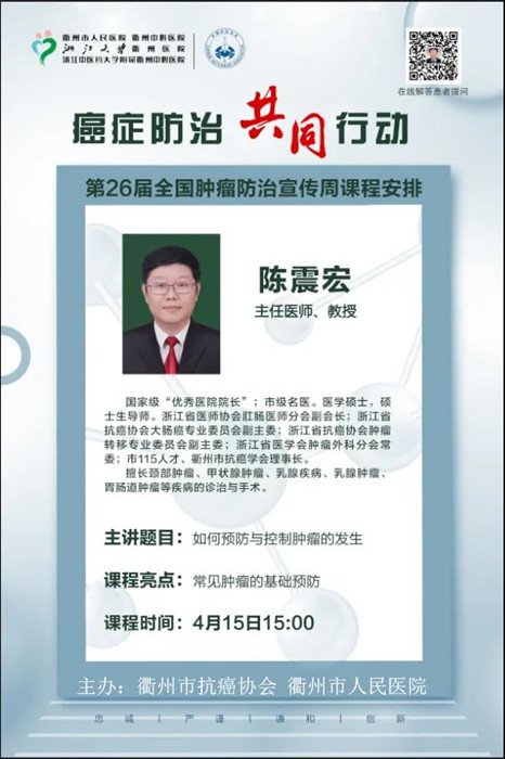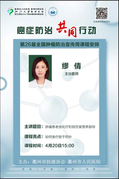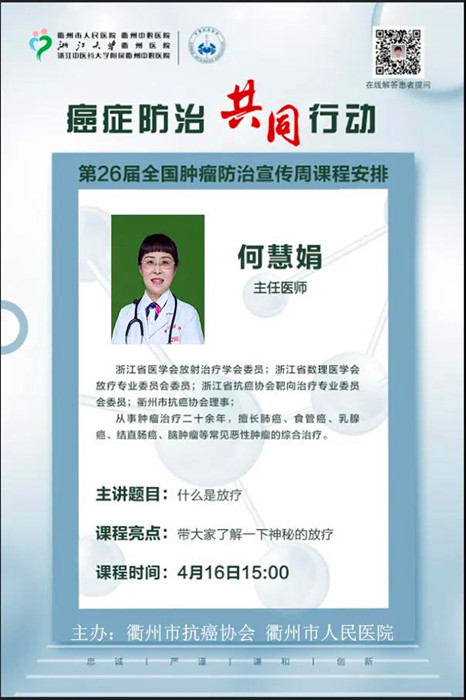 2020年4月15-21日是第26個全國腫瘤防治宣傳周,主題是“癌癥防治共同行動”。我院推出“腫瘤防治科普云課堂”, 4月15日開始,每日下午3:00,衢醫(yī)云課堂準時上線,還有腫瘤防治在線答疑,足不出戶也能漲知識,最重要的是免費!免費!免費!重要的事情說三遍,快把好消息轉出去!