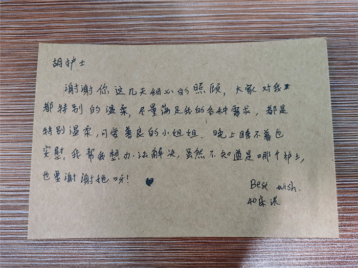 “謝謝你們的照顧,溫柔、可愛、善良的小姐姐們,你們安慰我,提供無(wú)微不至的幫助,十分感謝你們!”出院那天,患者洪女士留下了感恩的紙條,表達(dá)對(duì)腎內(nèi)科護(hù)士們真摯的感謝。