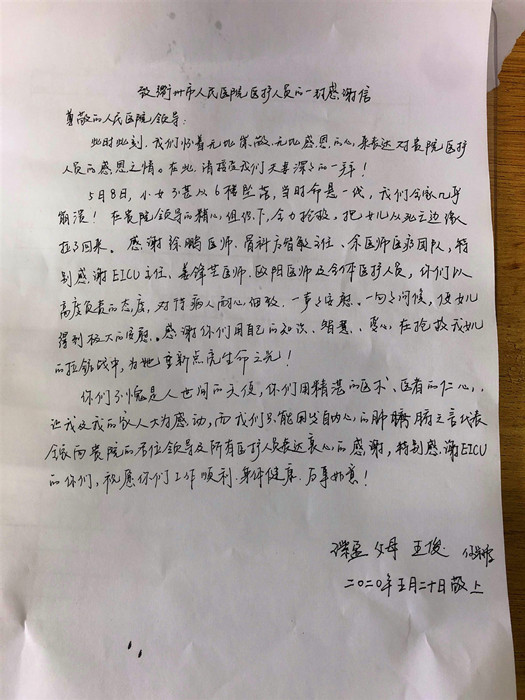“感謝你們用智慧、愛心,在搶救我女兒的拉鋸戰(zhàn)中,為她重新點亮生命之光!”近日,我院EICU醫(yī)護團隊收到一封誠意滿滿的感謝信。
