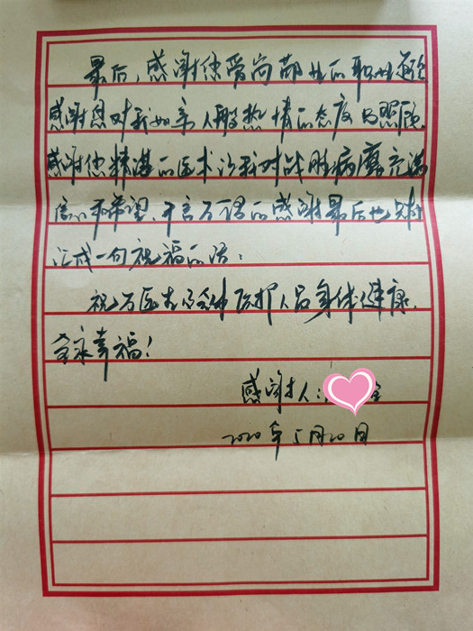 無獨(dú)有偶,患者繆先生在心胸外科手術(shù)期間,萬海軍醫(yī)師精湛的醫(yī)術(shù),熱心的態(tài)度深深感動(dòng)了他??祻?fù)出院后,他為萬海軍醫(yī)師寫下感謝信,將千言萬語的寄托于字里行間,表達(dá)內(nèi)心的謝意。