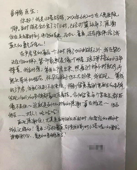 回想起分娩的情景,孫女士感恩在心,日前特地寫來感謝信表達感激之情:“尤其是當(dāng)我向你求助時,你答應(yīng)的眼神,我會記得!善良二字普通,卻是我目前對年幼的孩子唯一的要求,再次感謝你,善良的醫(yī)生!”字里行間流露出產(chǎn)婦的感謝,孫女士表示,如果沒有他的鼓勵和指導(dǎo),當(dāng)時就放棄順產(chǎn)了,是易醫(yī)生讓她堅持到最后,體驗初為人母的幸福。