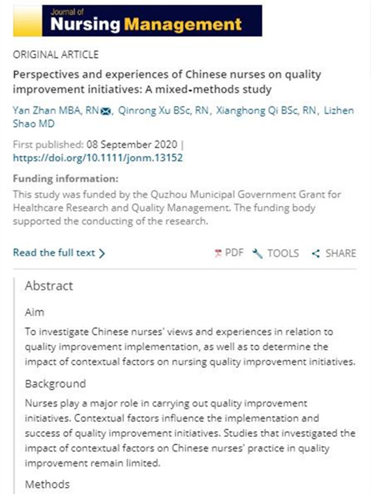 日前,從期刊官網(wǎng)傳來好消息,我院主管護師占妍撰寫的護理管理論文《中國護士對質量改進計劃的觀點與經歷:混合方法研究》《Perspectives and experiences of Chinese nurses on quality improvement initiatives: A mixed-methods study》發(fā)表在國際權威護理雜志《護理管理雜志》《Journal of Nursing Management》)上。