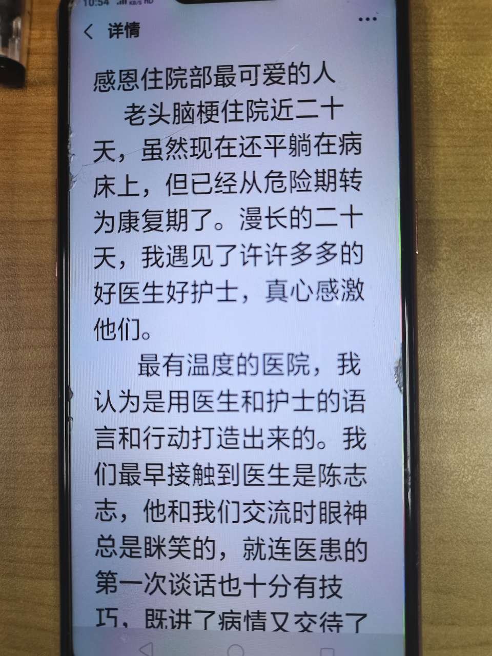 “醫(yī)院有兩道風景,在住院部認識的這些可愛的醫(yī)護人員是一道風景,還有一道風景是醫(yī)院的暖心服務(wù),‘37度最有溫度的醫(yī)院’讓我特別安心?!痹卺t(yī)護人員的悉心照料下,張老先生(化名)一天天康復,老太太內(nèi)心滿懷感激,寫下了一封飽含真情的感謝信---《感恩住院部最可愛的人》。