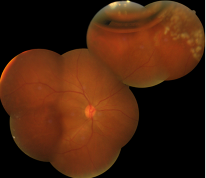 近2個月來,黃女士總是感覺右眼有黑影飄動,眼尾有障礙物遮擋視線,如同眼前蒙了塊布,揮之不去。起初,黃女士沒在意,沒想到,后來遮擋范圍越來越大。在女兒的催促下,黃女士來到了我院眼科進行檢查,結果令人瞠目:眼底有一個大小約3mm的馬蹄形視網膜裂孔,部分視網膜脫離。