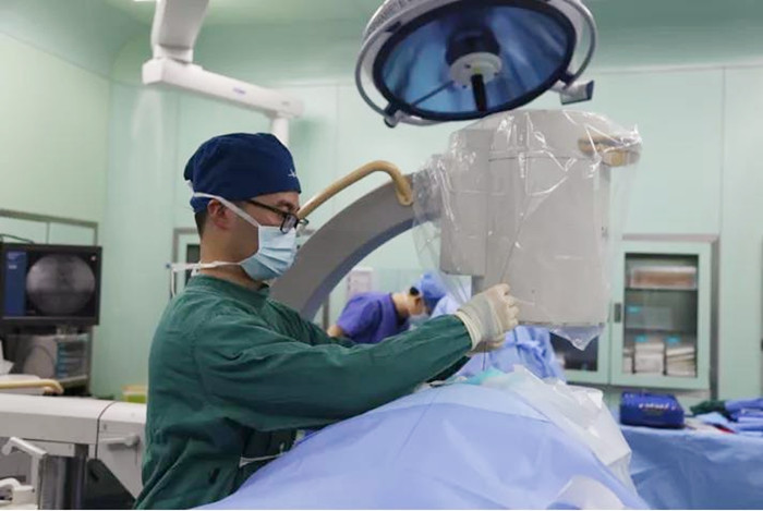 完善術(shù)前準(zhǔn)備后,在手術(shù)室團(tuán)隊(duì)的協(xié)作下,饒建偉為吳女士實(shí)施內(nèi)鏡下經(jīng)椎板間隙入路行椎間盤摘除術(shù)。在內(nèi)鏡的輔助下,吳女士全麻后,建立通道,將“障礙物”逐一剝除。突出部分的椎間盤摘除、神經(jīng)壓迫減輕,避免了傳統(tǒng)腰椎手術(shù)“破門而入”帶來的一系列軟組織創(chuàng)傷的問題。