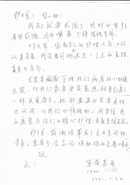 “感謝醫(yī)生護(hù)士對(duì)我的關(guān)心,特別是王筱護(hù)士盈盈的笑容,每天對(duì)我關(guān)切的詢問(wèn),總是幫助我安慰我,這份勝似親人的關(guān)心給予我最大的治愈?!奔磳⒊鲈?,王先生親手將感謝信送到護(hù)士長(zhǎng)張小芳手中。