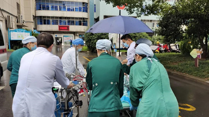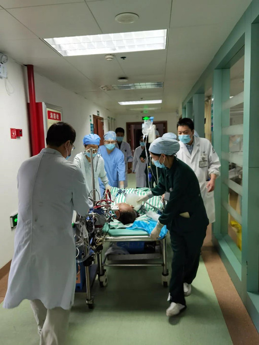 時(shí)間一點(diǎn)一點(diǎn)在流逝,朱先生的生命也在流逝。醫(yī)院急救快速反應(yīng)體系急速啟動(dòng),急診科主任吳德軍、醫(yī)務(wù)處處長柴東劍、醫(yī)療副院長何冬娟第一時(shí)間趕到現(xiàn)場參與急救,溫州醫(yī)科大學(xué)急診醫(yī)學(xué)專家、醫(yī)院執(zhí)行院長李章平教授隨后趕到現(xiàn)場指揮,院內(nèi)多學(xué)科急救團(tuán)隊(duì)成立,在持續(xù)心肺復(fù)蘇的同時(shí),即時(shí)超聲精準(zhǔn)評(píng)估心臟和容量狀態(tài),體外膜肺氧合(ECMO)團(tuán)隊(duì)快速行動(dòng),僅用13分鐘便成功在急診搶救室就地上機(jī)。在ECMO支持下,朱先生自主呼吸恢復(fù),血壓回升到80/60mmHg后被成功轉(zhuǎn)往重癥醫(yī)學(xué)科作后續(xù)治療。