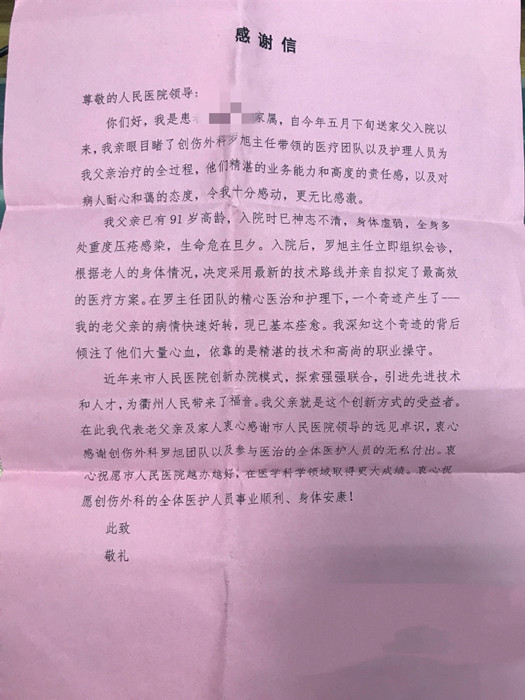 “你們精湛的業(yè)務(wù)能力和高度的責(zé)任感以及對(duì)病人耐心和藹的態(tài)度,令我十分感動(dòng),更無比感激……”姚老先生的家屬特地寫了一封感謝信,為我院和羅旭主任帶領(lǐng)的醫(yī)護(hù)團(tuán)隊(duì)點(diǎn)贊。