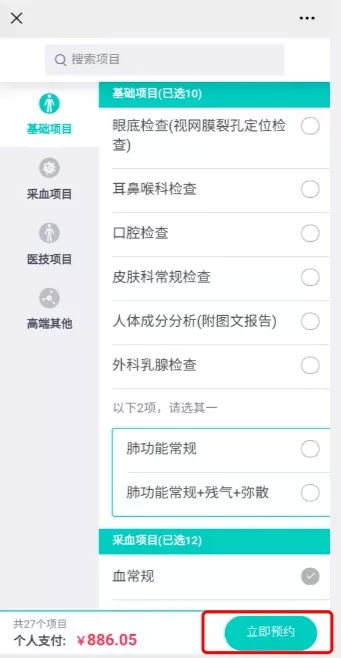 三、可以增加想要的體檢項目,點擊【立即預(yù)約】