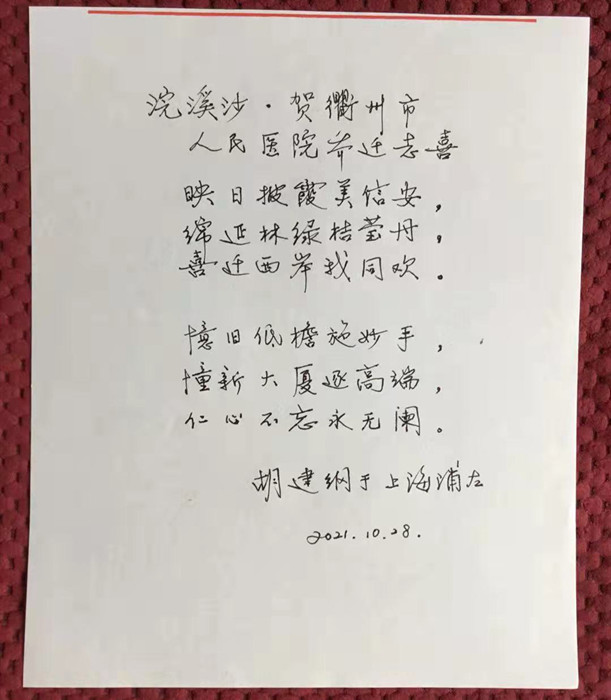 胡建綱曾于1983–1990期間擔(dān)任我院院長,在衢醫(yī)工作了近三十年,把自己的青春與激情都奉獻(xiàn)給了醫(yī)院,也見證了醫(yī)院的成長與發(fā)展。欣聞醫(yī)院搬遷,送上了滿滿的祝福!