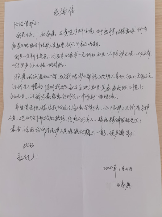 感謝信(致產(chǎn)科陸晗倩) 文章來源: 作者: 點擊數(shù):7858 更新時間:2022-01-24 上一篇: 感謝信(致骨科二主任王?。?/span> 下一篇: 錦旗(致麻醉科余功敏、許小峰)