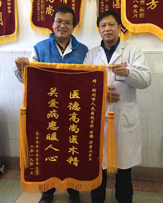 2月9日,家住柯城雙水橋的郭阿姨帶著一面寫有“醫(yī)德高尚醫(yī)術(shù)高,關(guān)愛病患暖人心”的錦旗來(lái)到了我院七病區(qū)骨科,將錦旗親手送給了蔣曙主任醫(yī)師和歷彥成醫(yī)師,向他們表達(dá)深深的謝意。